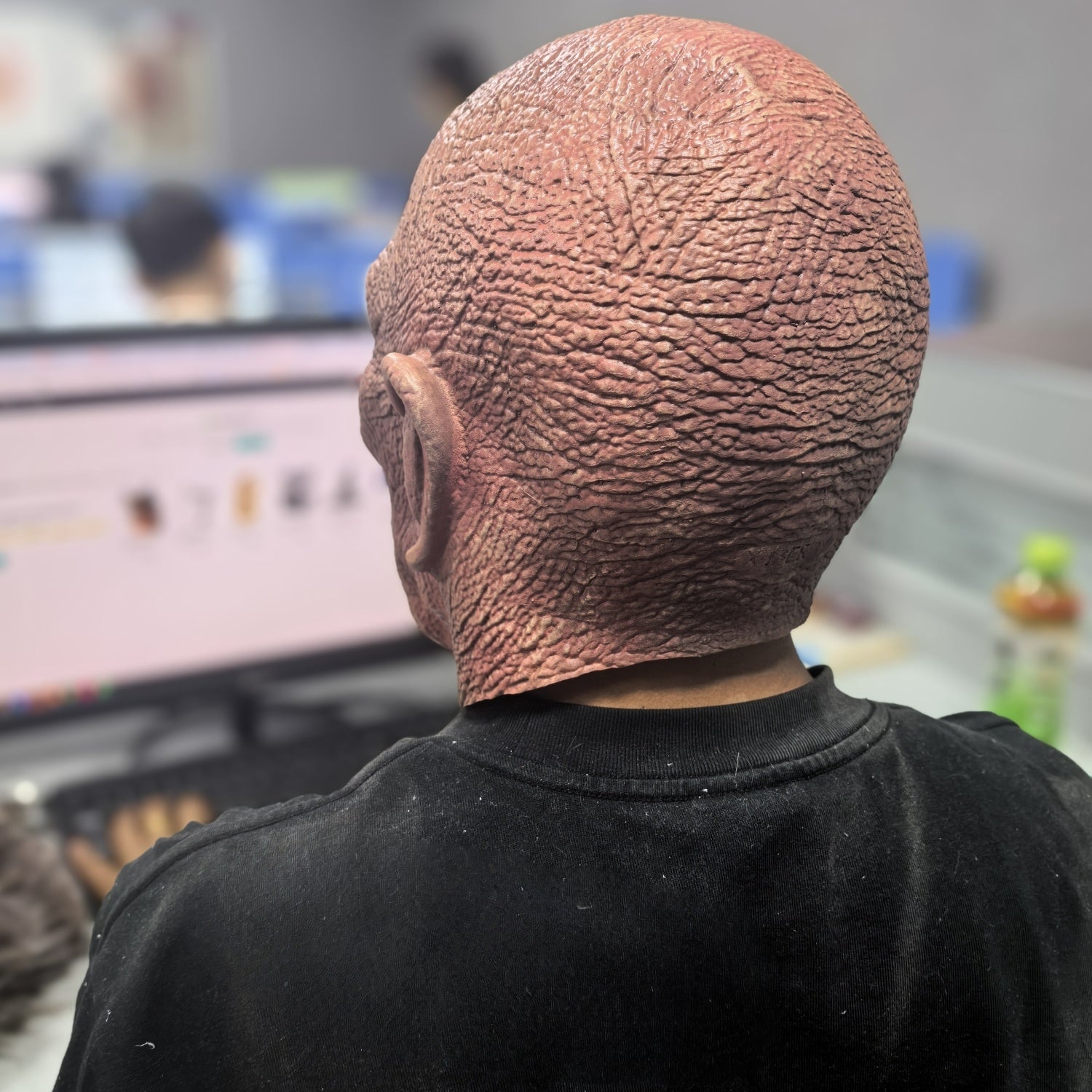 Universally unisex in appeal, its scowling expression and bald rubber structure suits any male or female dressed in costume or aiming for a distinct, edgy fashion statement.